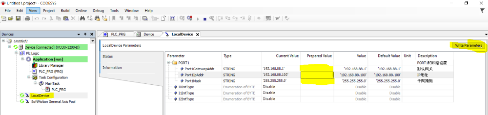 Online olduktan sonra “Prepared Value” yazan kısımdan yeni IP adresinizi girip sağ üstten “Write Parameters”